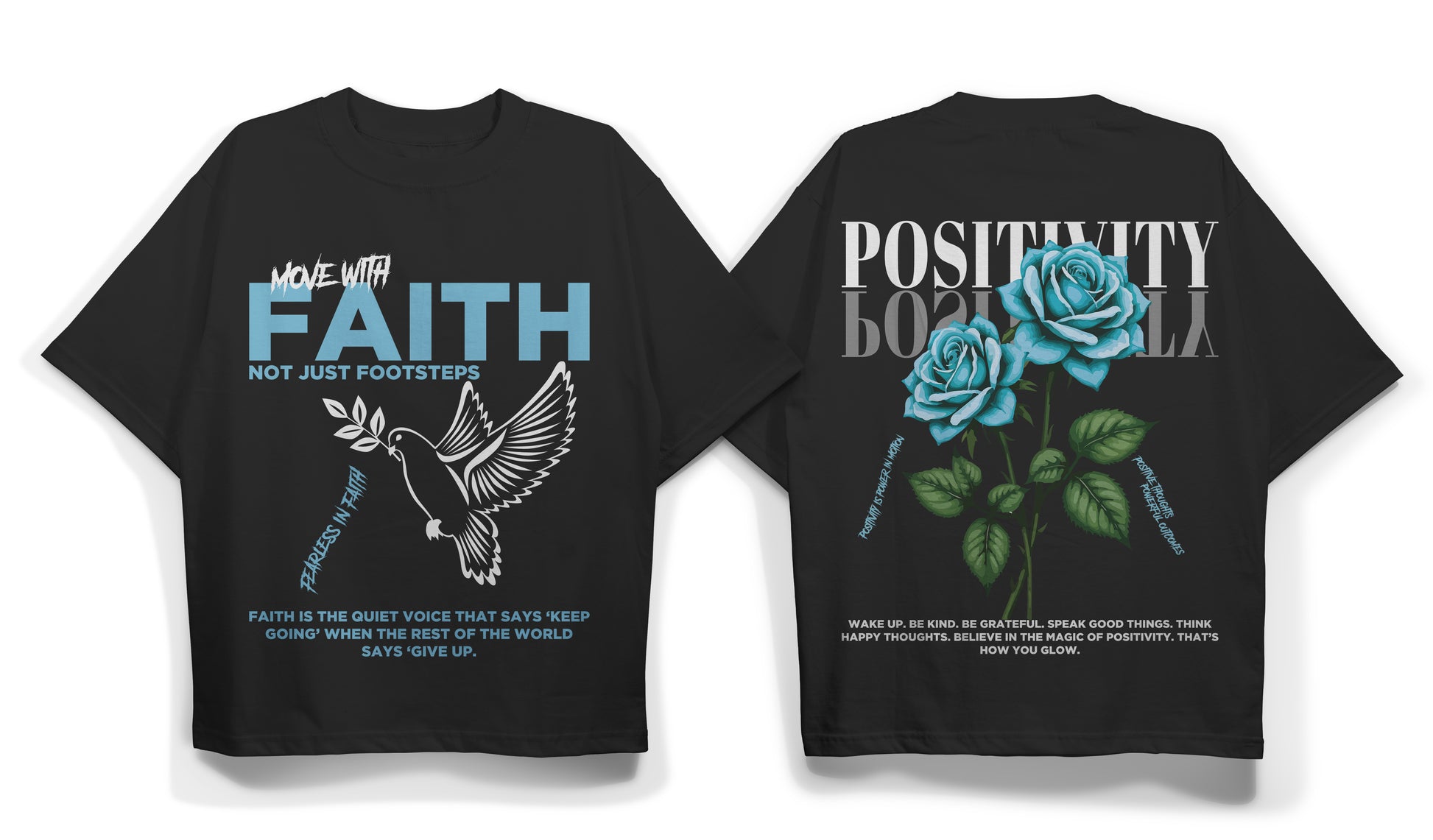 This isn’t just a shirt — it’s a statement. For anyone who's ever felt lost or is searching for purpose, this piece is your reminder to move with faith, not just footsteps. Every time you wear it, you're choosing light over darkness, and belief over doubt. The dove and rose represent strength in your spirit and softness in your heart — the perfect balance of power and peace. With faith comes positivity, and with positivity comes transformation.
